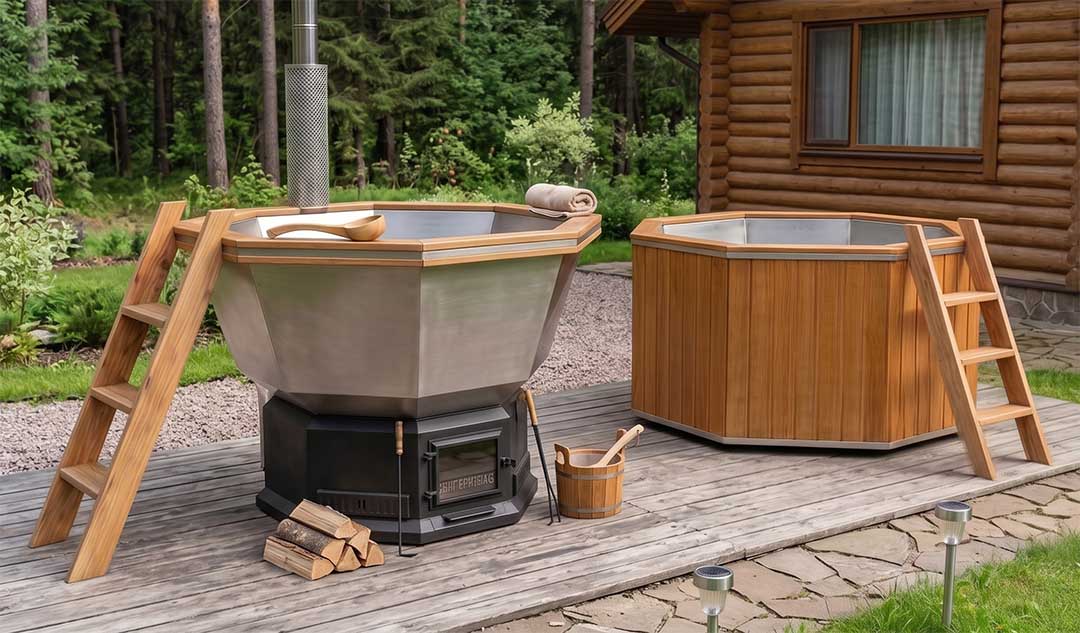 | Наружная отделка | Открытый металл (чаша на опоре/бревнах) | Сталь или декоративная деревянная обшивка фасада (по запросу) |