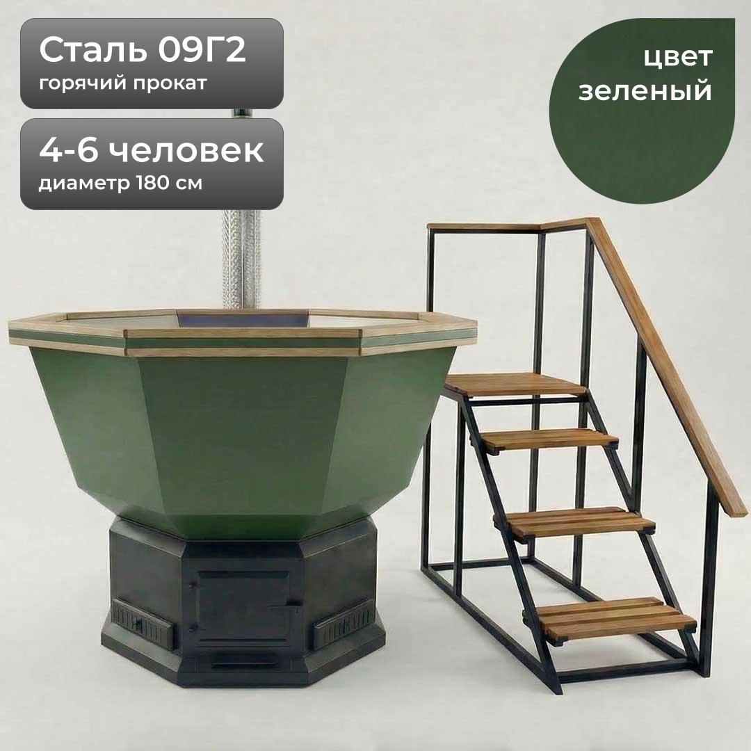 Диаметр 180 см позволяет комфортно разместиться компанией, а встроенная дровяная печь быстро нагревает воду и создаёт настоящий эффект банного отдыха.