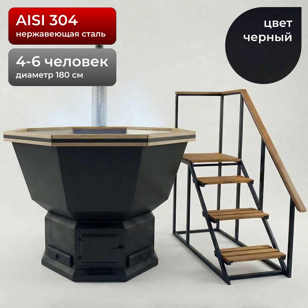 —Банный Чан на дровах из нержавейки на 4-6 человек 180см, AISI 304, Черный + лестница