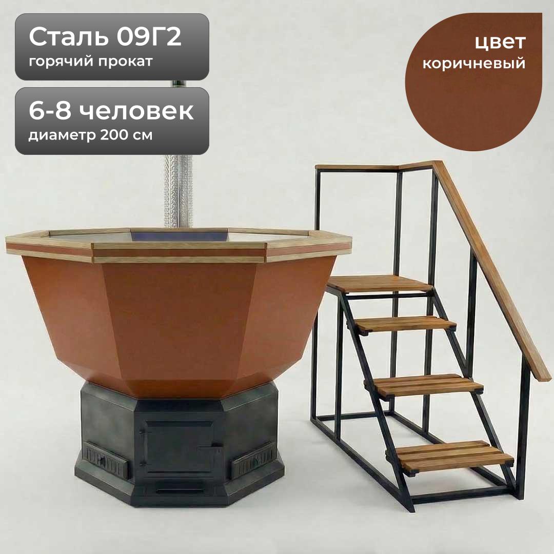 —Банный Чан с печью, для дачи на 6-8 человек 200см, Сталь 09Г2, Коричневый + лестница