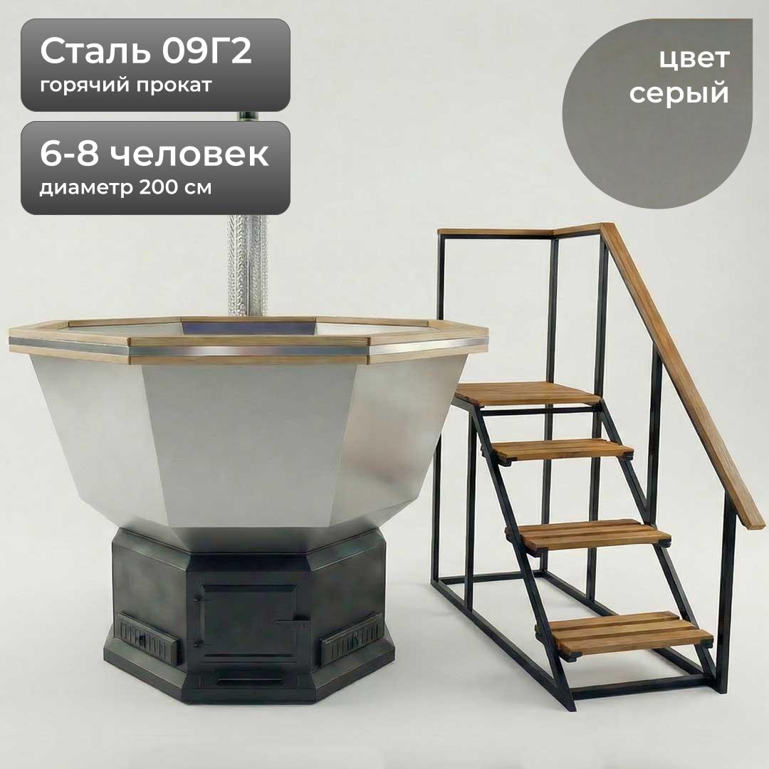 Банный Чан с печью на дровах 200см, Сталь 09Г2, Серый + лестница