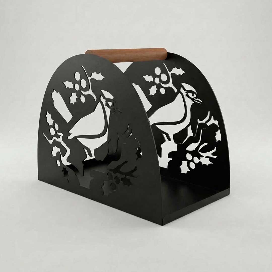 Красивая стальная дровница с деревянной ручкой, на обоих сторонах дровницы силуэт птицы и растительных элементов. Эта дровница обеспечит удобное и чистое хранение дров возле камина или печи, подходит для применения на улице и в доме.