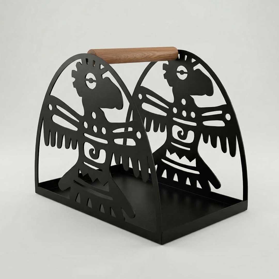 Прочная дровница из металла с национальным орнаментом на обоих сторонах. Снабжена удобной деревянной ручкой для переноса. Обеспечит удобное и чистое хранение дров возле печи, камина или мангала. Подходит для использования на улице и дома.