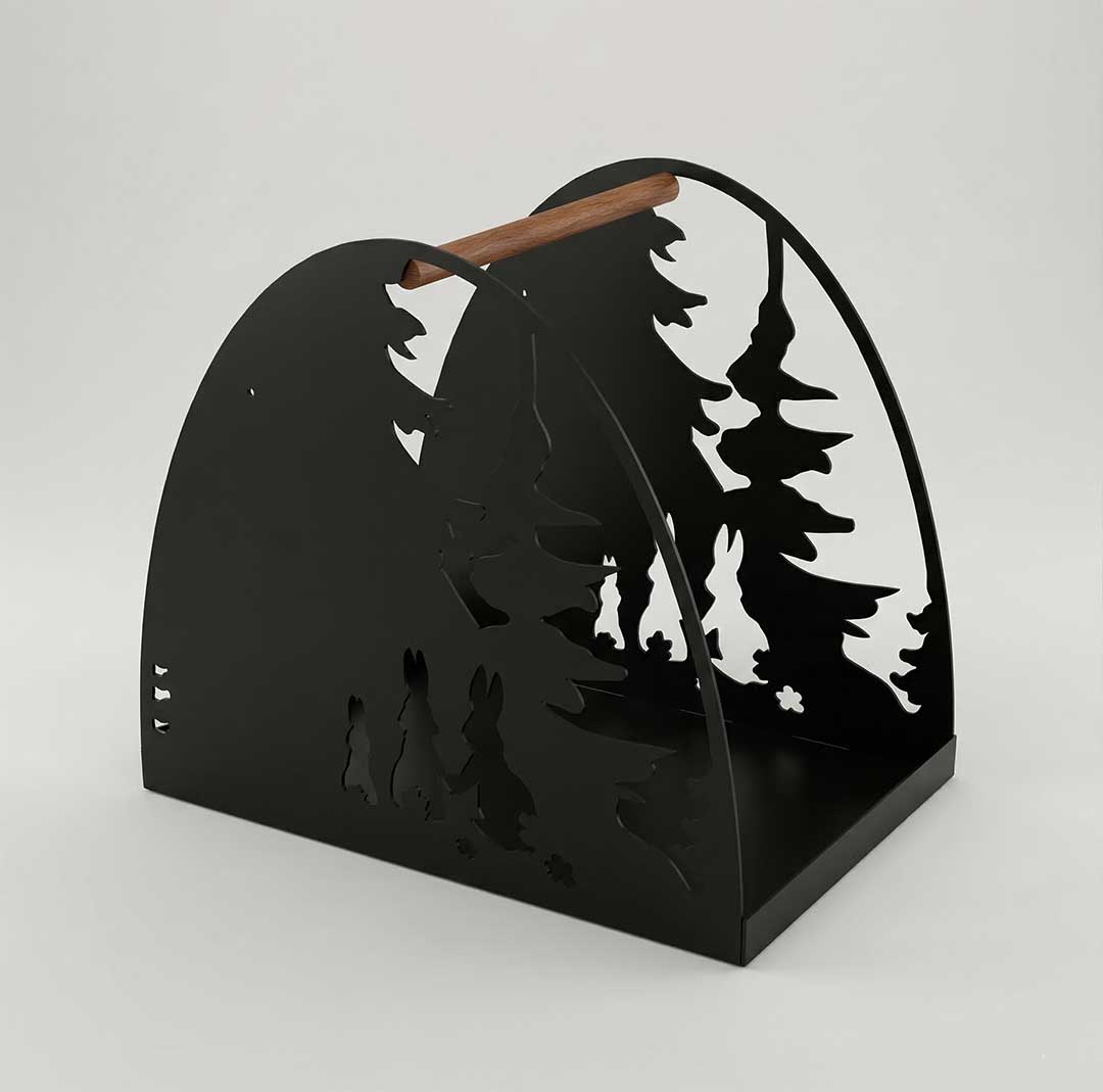 Стальная прочная дровница с силуэтами ёлок и зайцами, с удобной ручкой для переноски и сплошным дном. Отлично подходит для применения на улице и в доме. Обеспечивает удобное и чистое хранение дров возле камина, печи или мангала.