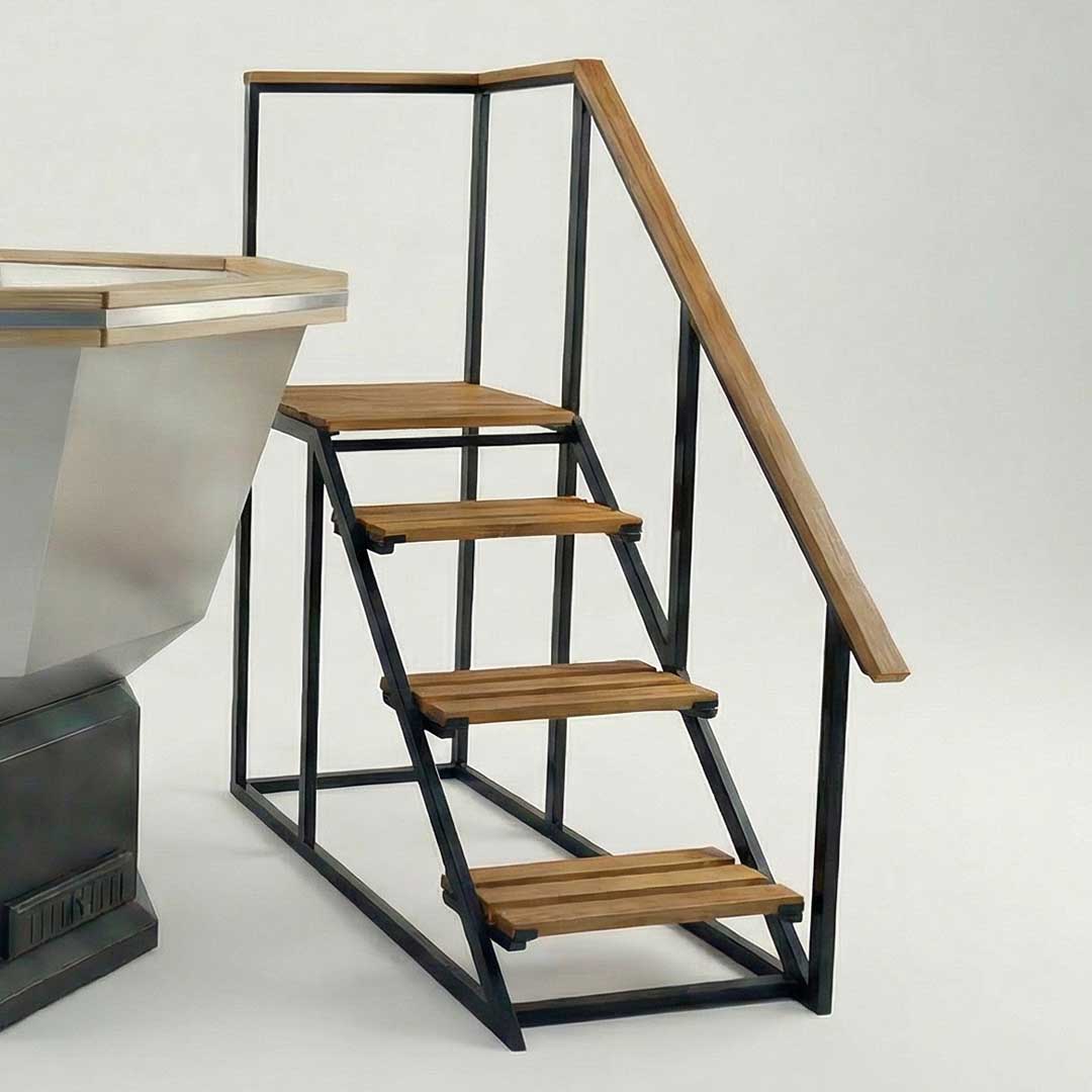 Лестница с поручнями и площадкой предназначена для максимально удобного и безопасного входа и выхода из банного чана. Конструкция оснащена устойчивой площадкой, которая обеспечивает комфортную опору перед погружением и после выхода из воды, а также удобными поручнями, повышающими уровень безопасности и уверенности при использовании. Лестница рассчитана на эксплуатацию во влажной среде и при перепадах температур, отличается прочностью и устойчивостью.