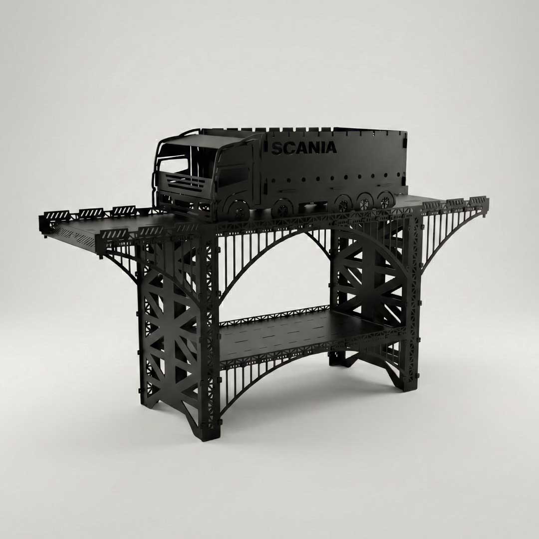 Мы уделили особое внимание узнаваемым деталям знаменитого грузовика. Кабина Скания и элементы кузова вырезаются на высокоточных лазерных станках, создавая впечатляющий объемный силуэт. За эффектным внешним видом скрывается бескомпромиссная практичность: