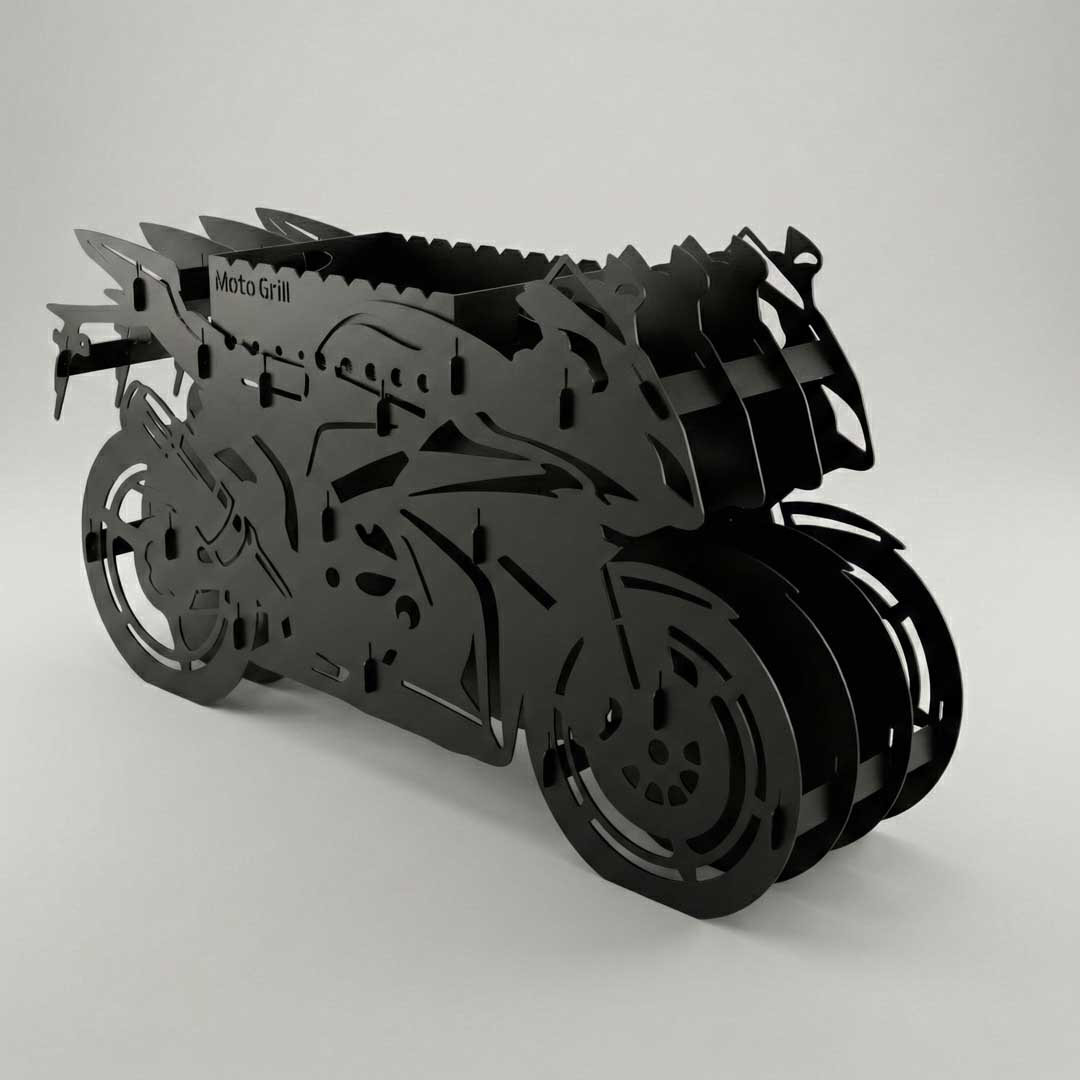 При создании этой модели мы объединили стремительную эстетику двухколесной техники с исключительной практичностью. Силуэт мотоцикла вырезан на высокоточном лазерном оборудовании, а сама конструкция рассчитана на долгие годы активного использования под открытым небом: