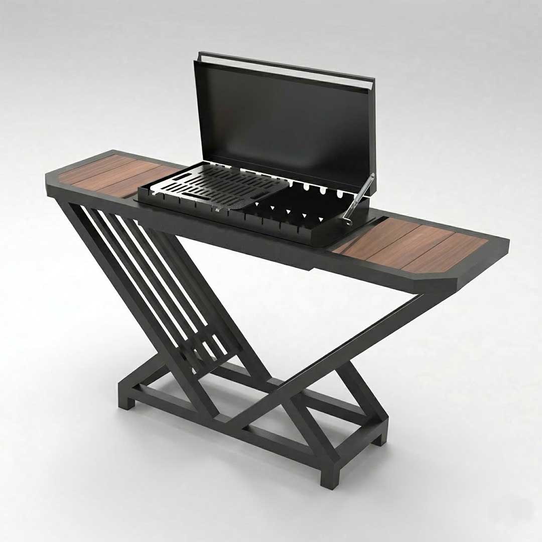 - Усиленный стальной каркас. Основание, выполненное из качественной профильной трубы, обеспечивает монолитную жесткость всей системы. Геометрия рамы продумана так, чтобы исключить любые люфты и покачивания даже при полной загрузке жаровни.