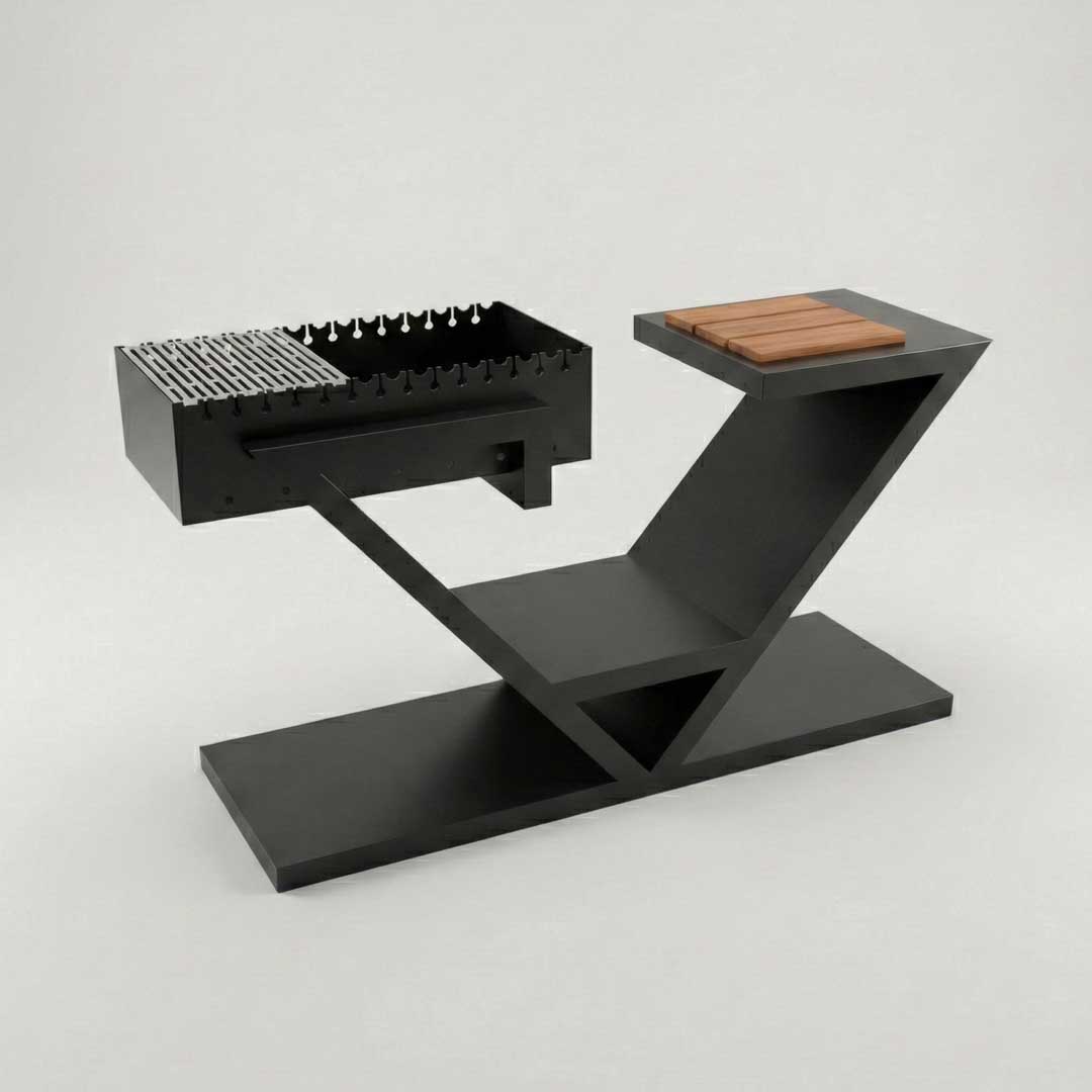 - Архитектурный силуэт. Четкая геометрия стального каркаса и отсутствие лишних деталей делают мангал центральным элементом ландшафта. Дизайн в стиле лофт органично дополняет современные террасы, патио и беседки, превращая зону готовки в стильный арт-объект.