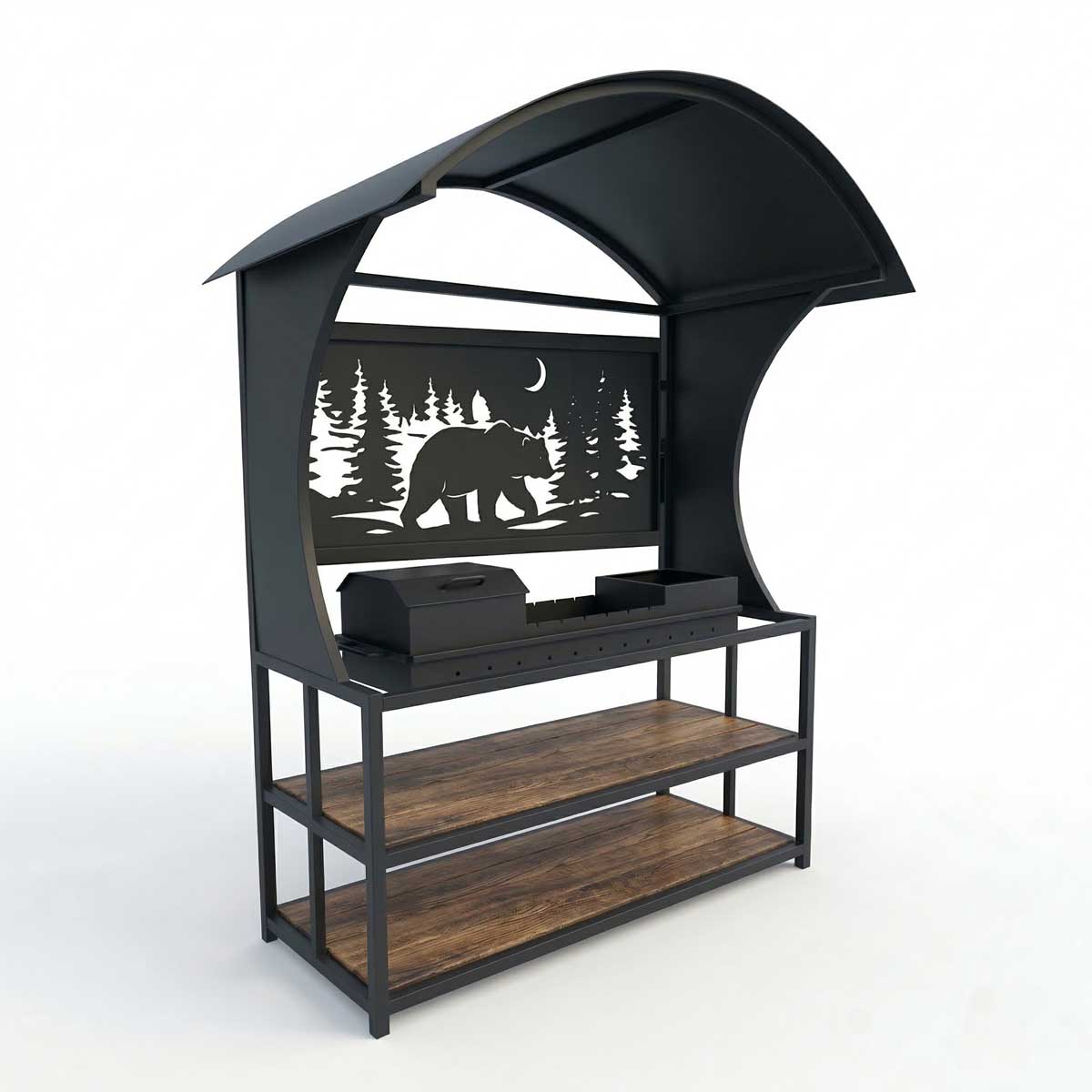 Ключевой особенностью комплекса является высокий защитный экран с искусно вырезанным силуэтом хозяина тайги. Мы разработали конструкцию, где эстетика органично дополняется техническим совершенством: