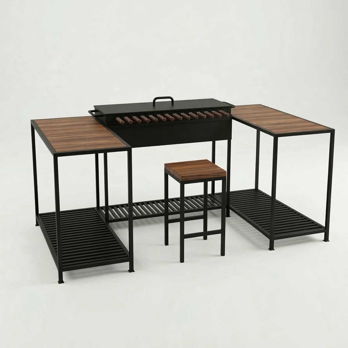 - Многоуровневая система хранения. Конструкция включает в себя удобные полки для дров, посуды и специй, позволяя организовать полноценную летнюю кухню под открытым небом.